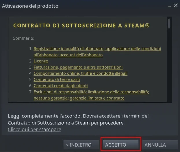- Seleziona l'opzione "Accetto", poiché l'accordo di abbonamento a Steam dovrà essere accettato per poter continuare.
