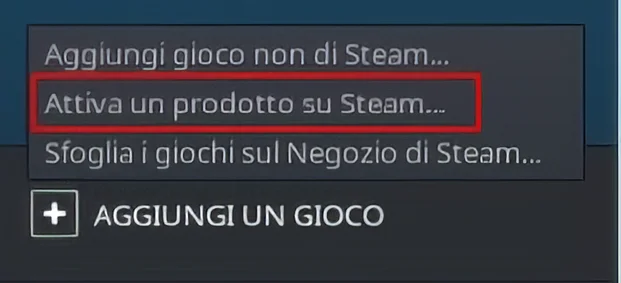 - Dopo aver scaricato e avviato il launcher, accedi con i tuoi dati e seleziona "AGGIUNGI UN GIOCO" come mostrato nell'immagine seguente. Vedrai a schermo 3 opzioni dalle quali dovrai selezionare "Attiva un prodotto su Steam...".